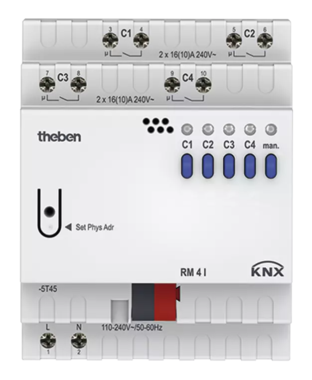 Der RM 4 I KNX (Art.-Nr. 4940210) von Theben ist ein leistungsstarker 4-fach-Schaltaktor für KNX-Installationen, geeignet für hohe elektrische Lasten wie LED-Leuchten, Leuchtstofflampen, Glüh- und Halogenlampen. Dank des FIX1-Moduls ist dieser Aktor für kapazitive Lasten (C-Last) bis 16 A optimiert und verfügt über eine Stromerkennung pro Kanal. Die Schaltausgänge sind manuell bedienbar – auch ohne Busspannung – und bieten eine LED-Statusanzeige je Kanal.