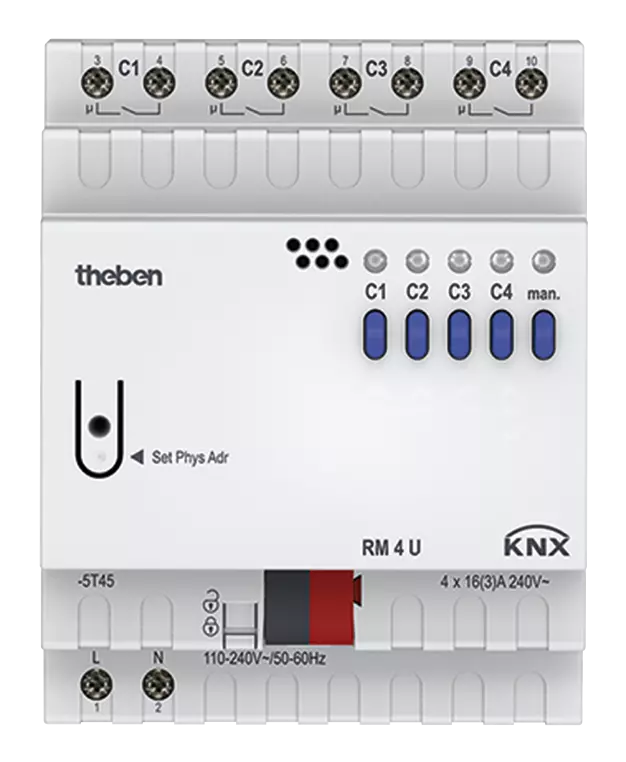Der RM 4 U KNX von Theben ist ein vielseitiger 4-fach Schaltaktor für KNX-Installationen. Das FIX1-Modul macht das Gerät geeignet für das Schalten von Lasten bis 16 A. Dank manueller Bedienung und LED-Statusanzeige pro Kanal ist das System sowohl zuverlässig als auch benutzerfreundlich. Ideal zum Schalten verschiedener Leuchtmittel wie LEDs, Leuchtstofflampen sowie Glüh- und Halogenlampen in Wohn- und Zweckbauten.