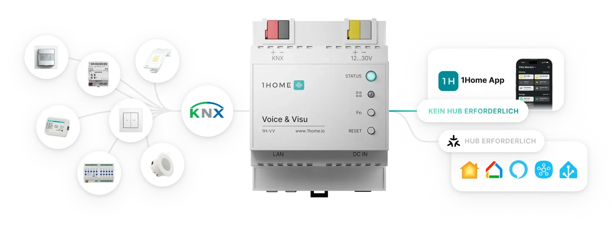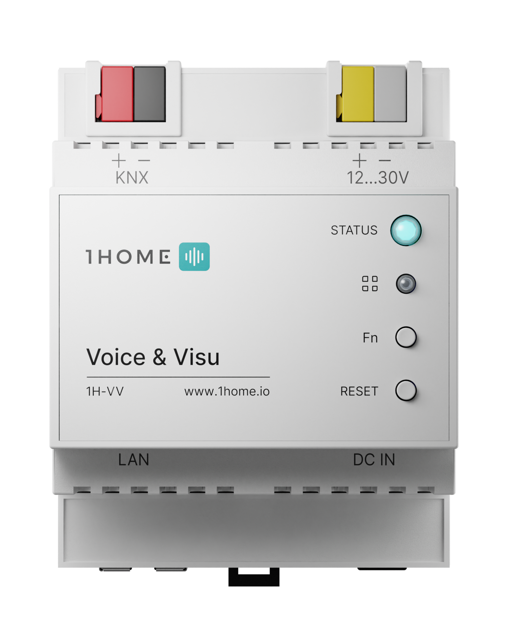 The 1Home Voice & Visu is a local KNX server that bridges the professional and highly reliable KNX world with modern smart home platforms using the new Matter standard. This enables app and voice control for KNX installations without compromising reliability, privacy or local operation.