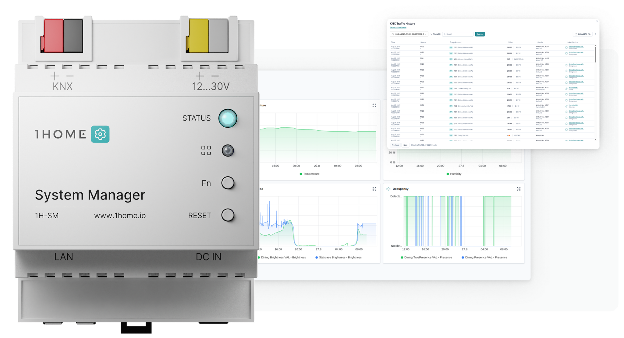 The 1Home System Manager is a powerful, locally operating KNX System Manager designed for professional diagnostics, monitoring and management of KNX installations. It is ideal for system integrators, installers and operators who require full transparency and control of their KNX systems at all times.