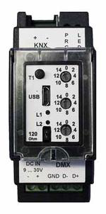 Gateway between KNX and DMX512 bus. Controls up to 512 channels, 64 scenes, and 16 sequences. Compact DIN rail device (2TE) with USB and manual addressing. Read more