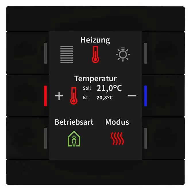 The Push-button Smart 86 with an integrated temperature sensor offers extensive possibilities for room temperature control. In combination with an MDT heating actuator, an efficient temperature control system can be configured and visualized.