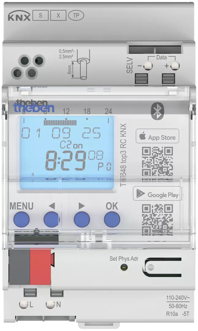 The TR 648 top3 RC KNX is an advanced digital time switch for KNX systems, featuring a yearly and astro program and an integrated Bluetooth Low Energy (BLE) module for easy app programming. Designed for professional building automation, it offers extensive programming options and numerous innovative features for maximum flexibility and security.