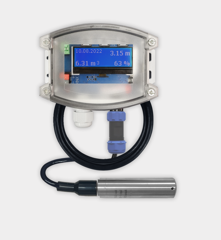 - Valores medidos: Nivel en %, distancia, volumen en m³