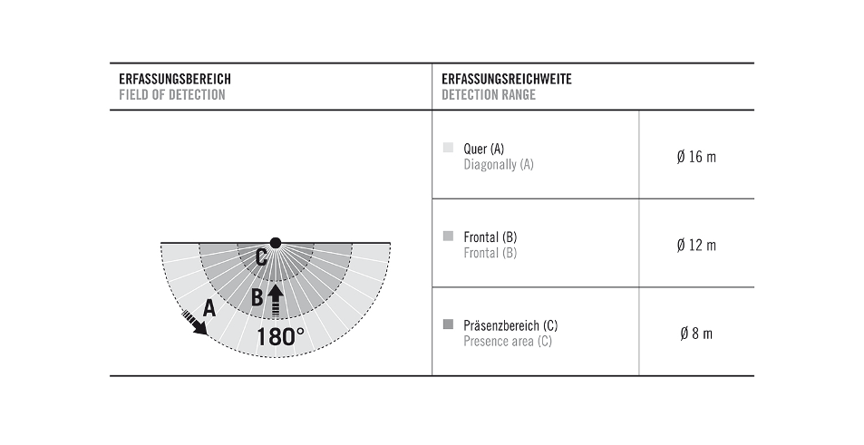 - Alcance de detección: Ø 16 m (diagonal), Ø 12 m (frontal), Ø 8 m (presencia)