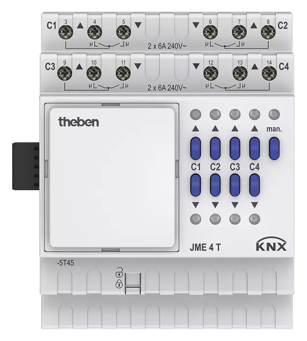 El JME 4 T KNX es un actuador de persianas de 4 canales de Theben, utilizado como módulo de expansión en un sistema MIX2. Está diseñado para controlar persianas, estores, sistemas de sombreado y oscurecimiento, ventanas de tejado y compuertas de ventilación. Este dispositivo solo funciona en combinación con un módulo base MIX2 con lógica KNX integrada.