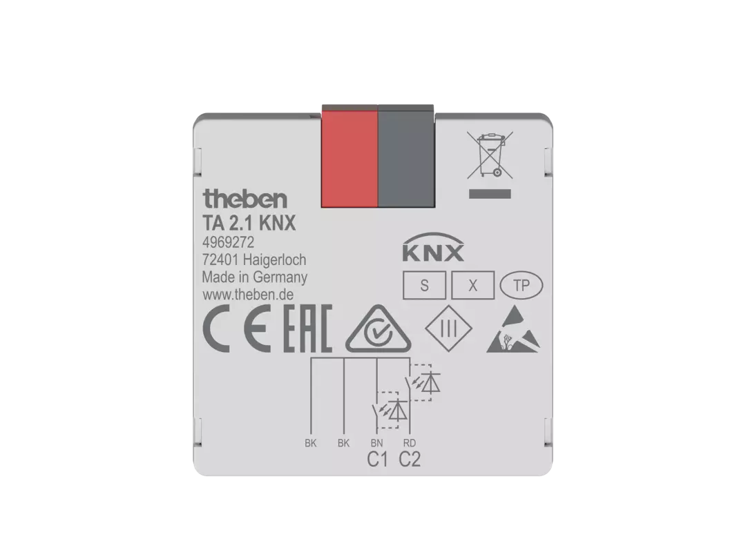 La TA 2.1 KNX puede combinarse directamente con pulsadores o interruptores convencionales y encaja perfectamente en cajas de empotrar estándar. Los usuarios pueden asignar libremente todas las funciones, incluyendo interruptor/pulsador, regulación, control de persianas, transmisor de valores, secuencias y control LED. El control flexible de LED permite manejar tanto LED comerciales como LED de baja corriente con una corriente de salida de 3 mA.
