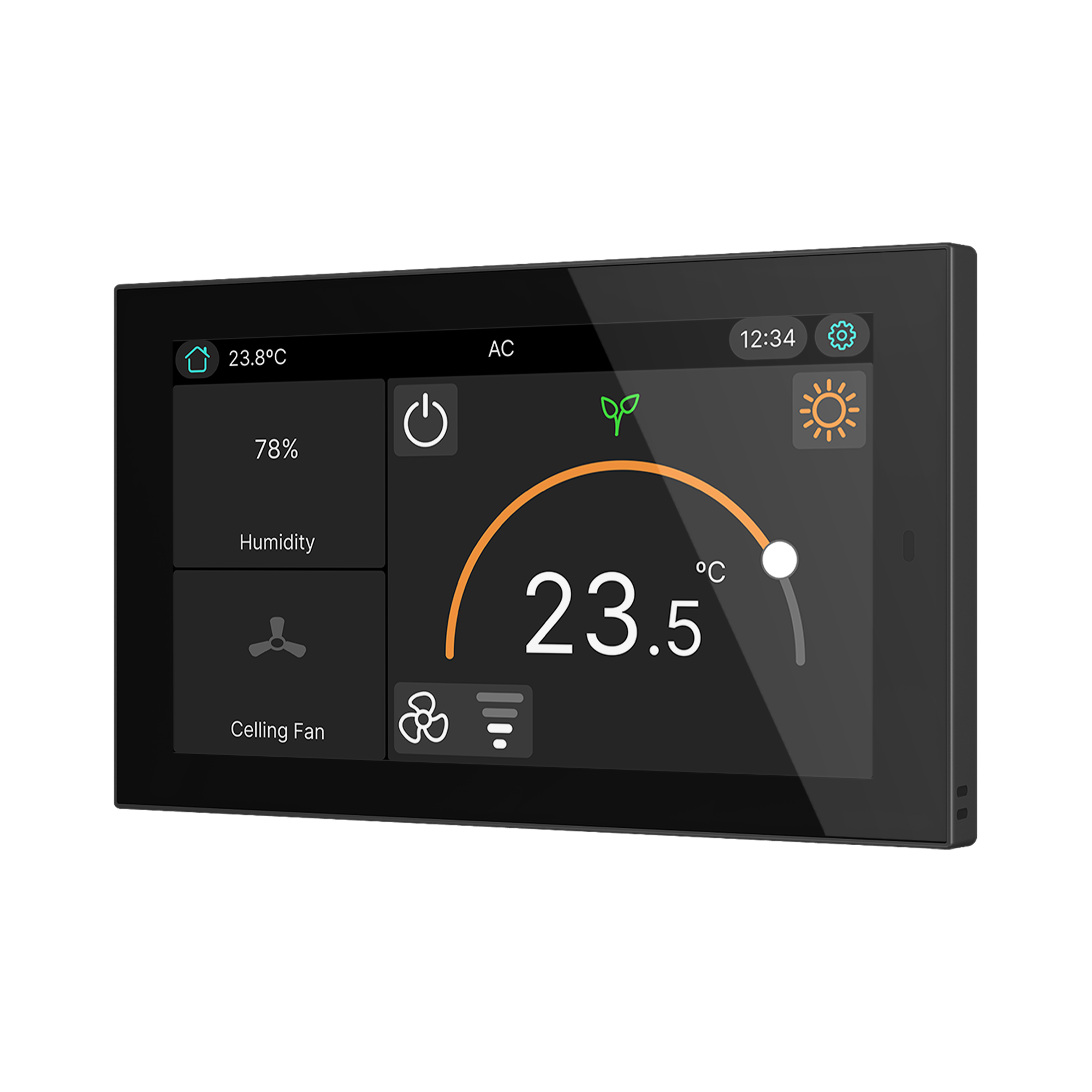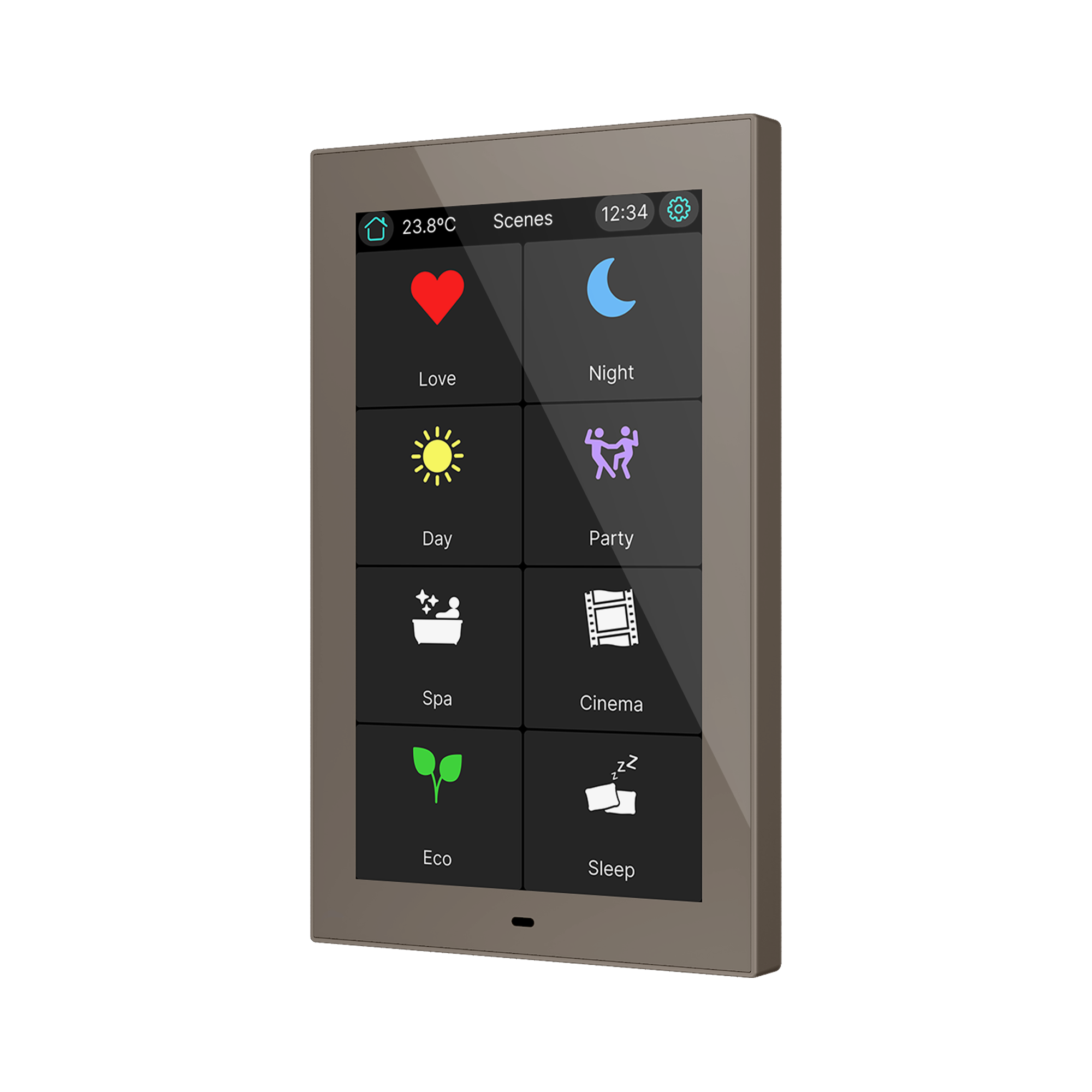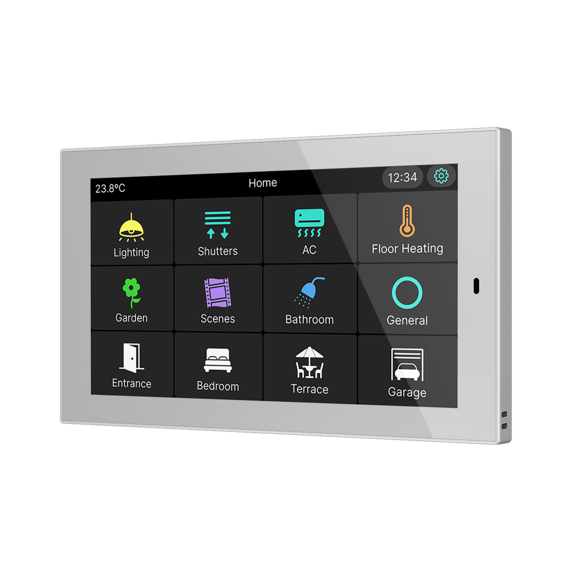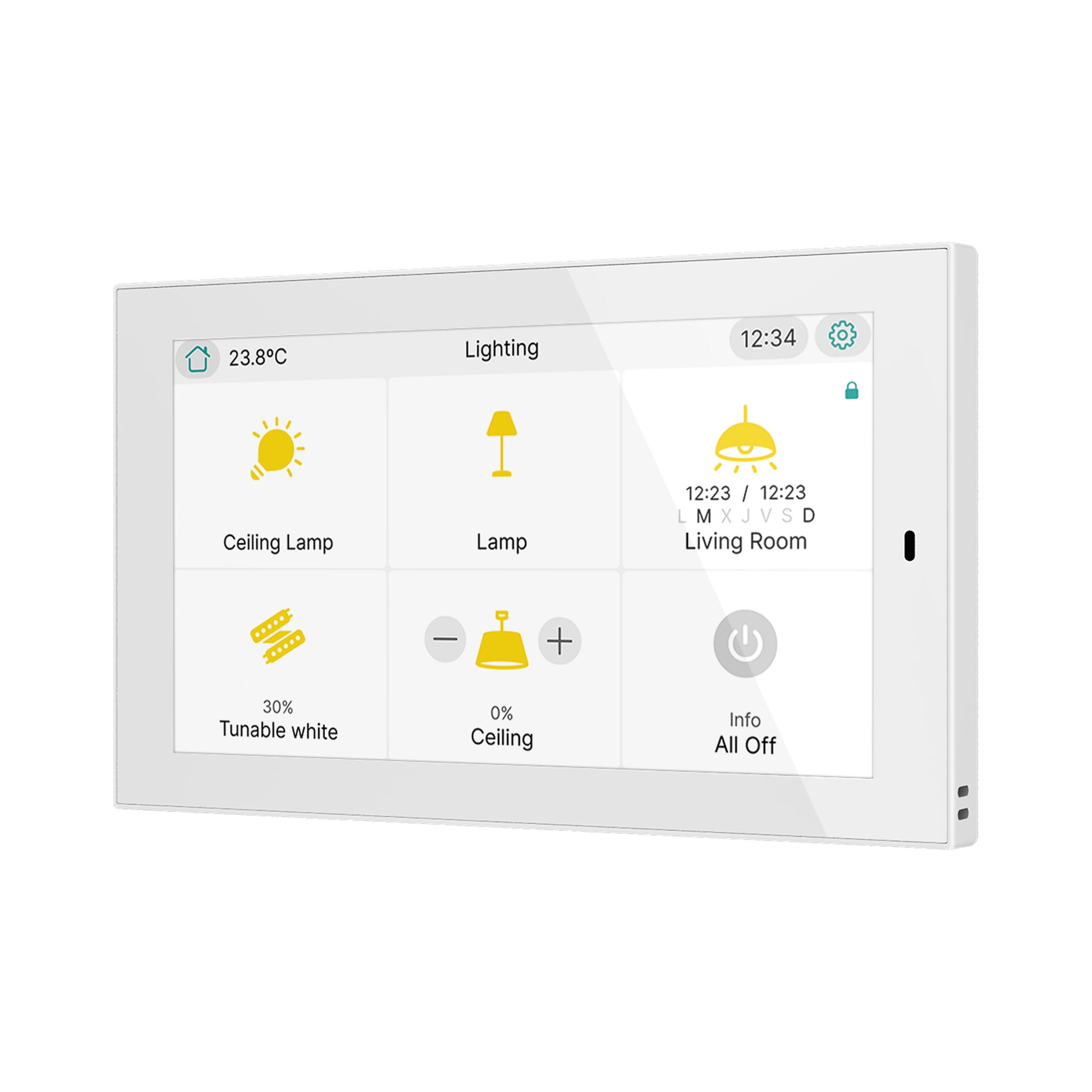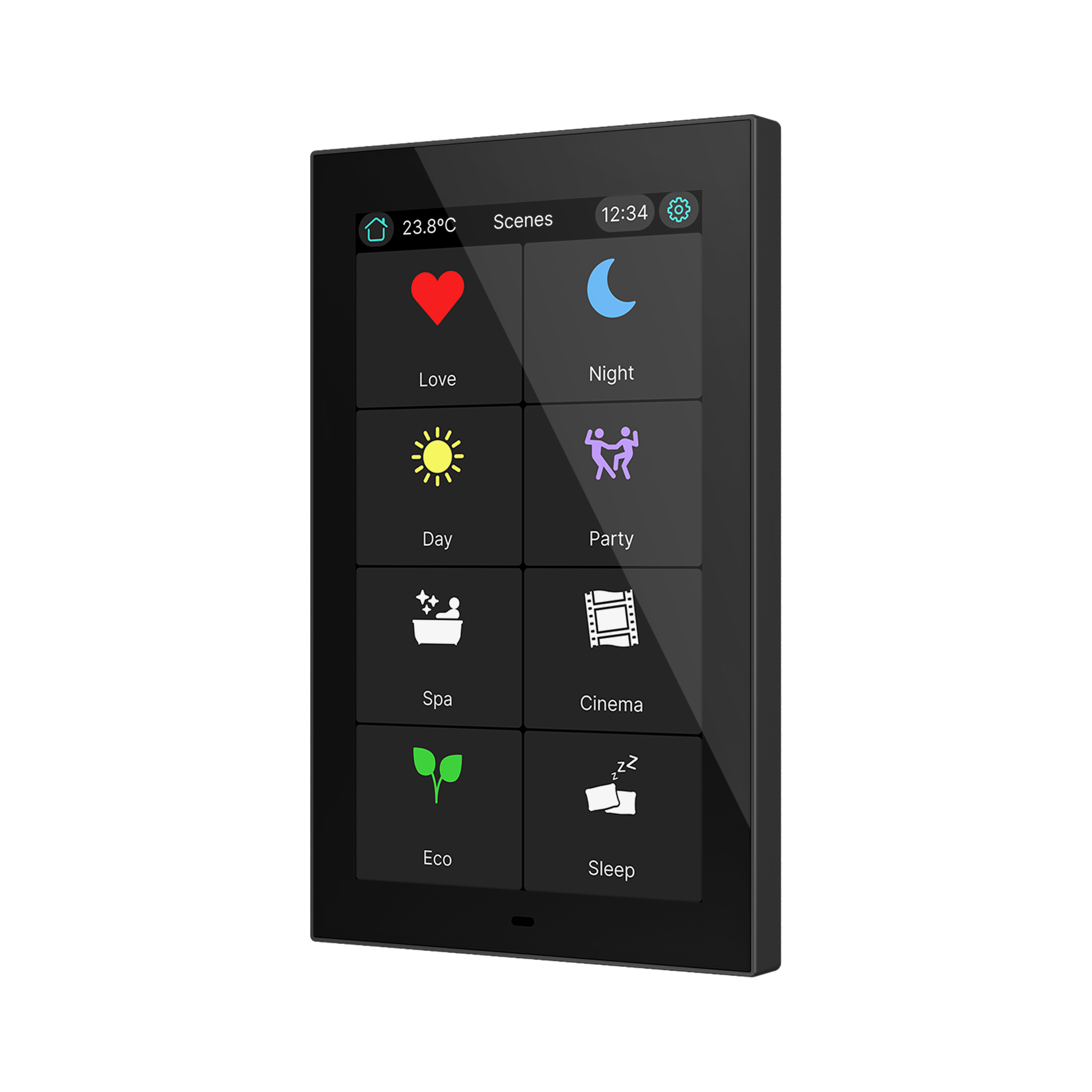Panneau tactile KNX 5" avec 12 pages et 96 fonctions. Contrôle éclairage, stores et CVC. Capteurs température, humidité, luminosité et proximité, 4 entrées et KNX Secure. Montage en boîte standard. Lire plus