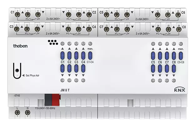 Il JM 8 T KNX è un attuatore KNX a 8 canali progettato per il controllo di tapparelle, tende, sistemi di schermatura e oscuramento, lucernari e serrande di ventilazione. Progettato per l’installazione su guida DIN, consente il controllo manuale per ogni canale anche in assenza di tensione sul bus KNX. La tecnologia FIX2 garantisce un'integrazione affidabile nei sistemi KNX per la building automation.