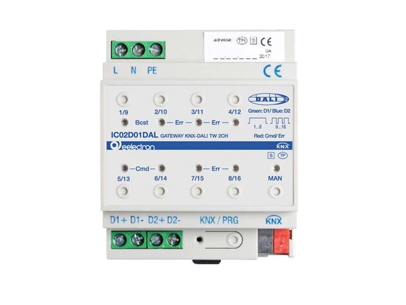 De Eelectron IC02D01DAL is een universele KNX–DALI-gateway met twee volledig onafhankelijke kanalen (Single Master Application Controllers) voor het aansturen van elektronische voorschakelapparaten (ECG’s) met een DALI-interface volgens EN 62386. Elk kanaal ondersteunt maximaal 64 ECG’s, individueel of in tot 16 DALI-groepen, waarmee in totaal tot 128 apparaten via één gateway kunnen worden beheerd. De module is geschikt voor Tunable White (DT-8) en DALI-2 verlichtingstoepassingen en wordt rechtstreeks gevoed vanuit de gateway – een extra DALI-voeding is niet nodig of toegestaan.