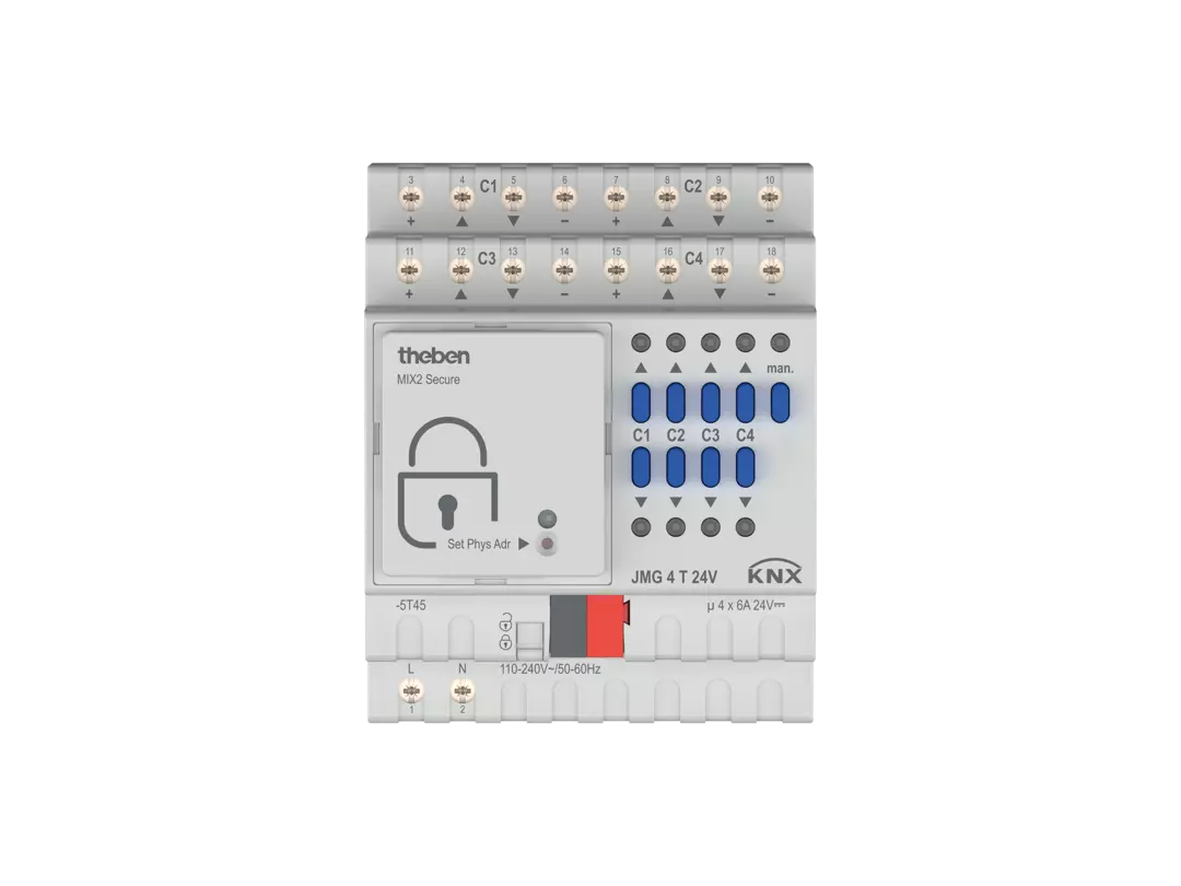 De JMG 4 T 24V KNX is een 4-voudige jaloezieactor van Theben, speciaal ontwikkeld voor de aansturing van 24V jaloezieën, rolluiken, zonwerings- en blinderingssystemen, dakramen en ventilatiekleppen. Deze basismodule is onderdeel van het modulaire MIX2-systeem en kan worden uitgebreid tot maximaal 12 kanalen door middel van twee uitbreidingsmodules.