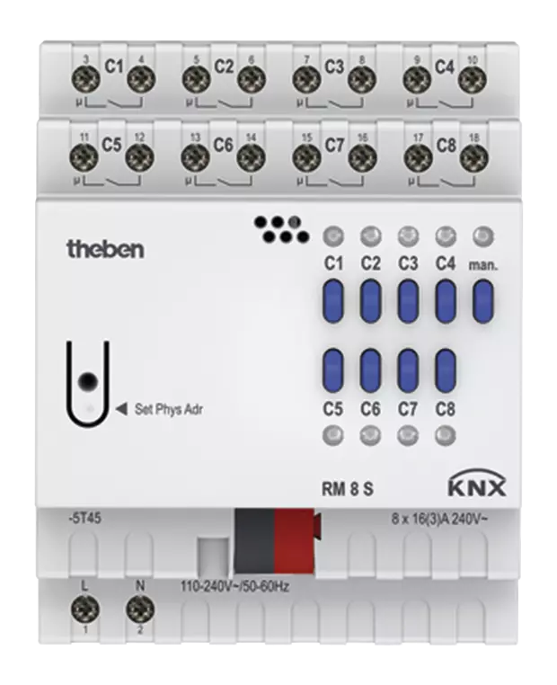 O RM 8 S KNX da Theben é um atuador de comutação KNX compacto e potente de 8 canais, projetado para controlar diferentes tipos de cargas elétricas como lâmpadas incandescentes, halógenas, fluorescentes e LEDs. Com o módulo FIX1, é adequado para cargas capacitivas (C-Load). Cada saída possui indicação de estado por LED e pode ser operada manualmente mesmo sem tensão de barramento. Uma solução confiável para instalações de automação KNX exigentes.