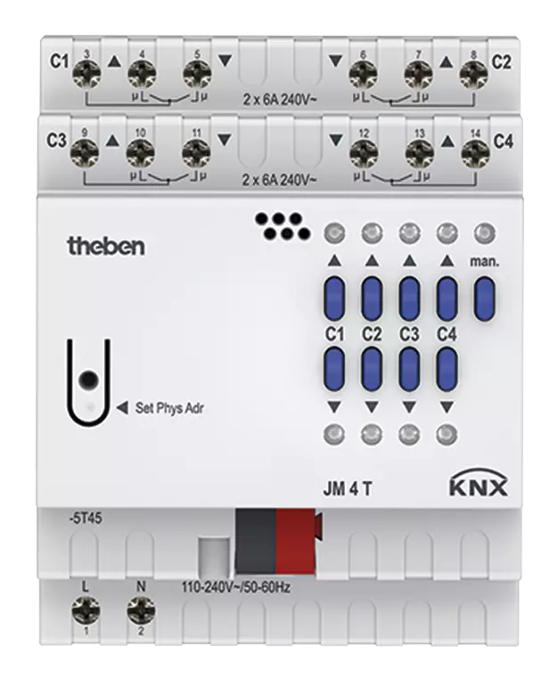 O JM 4 T KNX é um atuador KNX de 4 canais projetado para controlar sistemas de proteção solar como estores, persianas, toldos, claraboias e grelhas de ventilação. O dispositivo permite o controlo manual mesmo sem tensão de bus e fornece indicação de estado por LED para cada canal. Com tecnologia FIX1, garante uma integração KNX fiável em sistemas de automação de edifícios.